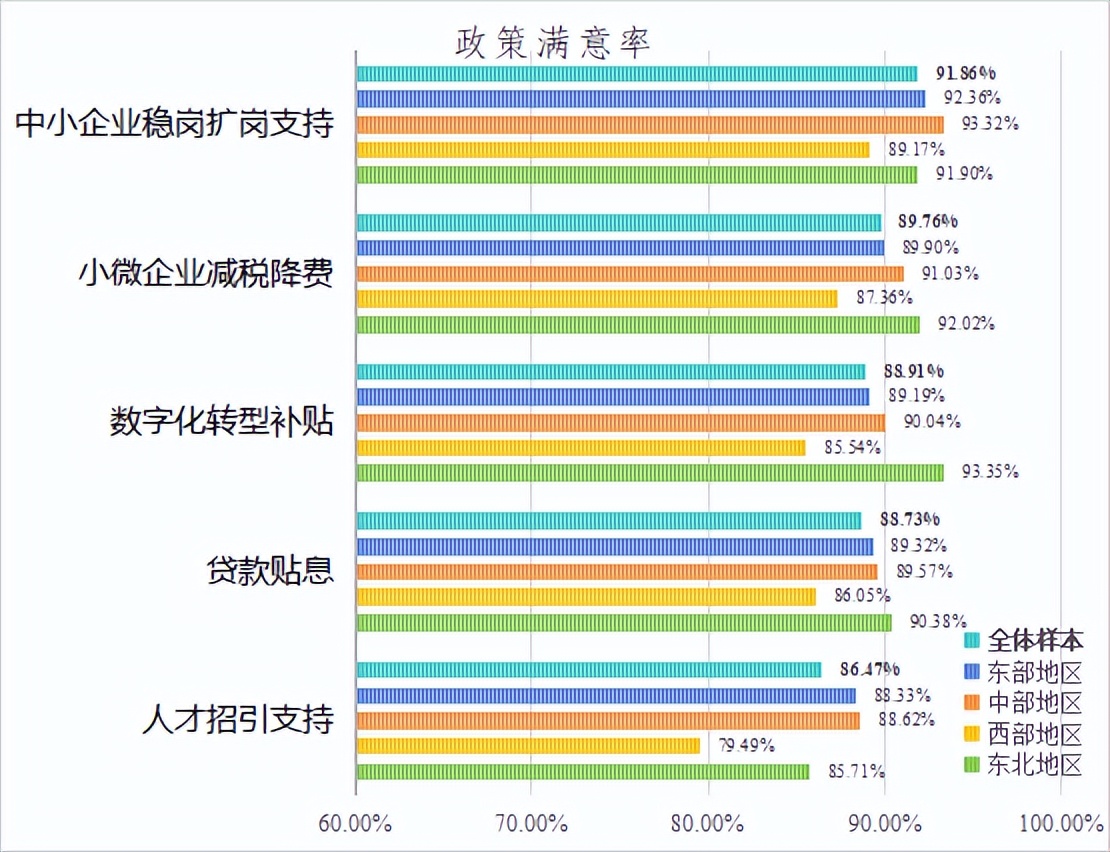 更多惠企政策实现直达快享。各参评城市深入落实《中小企业促进法》,促进中小企业发展工作机制运转更加高效,41个参评城市建立中小企业工作督查机制,聚焦政策落实、资金使用、服务效能等重点领域开展督查。各参评城市均设立中小企业发展专项资金,重点支持中小企业高质量发展和服务体系建设。同时,积极推动“政策找人”“免申即享”落地见效,惠企政策覆盖面持续提升。问卷调查显示,小微企业减税降费、稳岗扩岗、贷款贴息等支持政策享受度较高。从企业满意情况看,各项惠企政策整体满意率均超过80%。