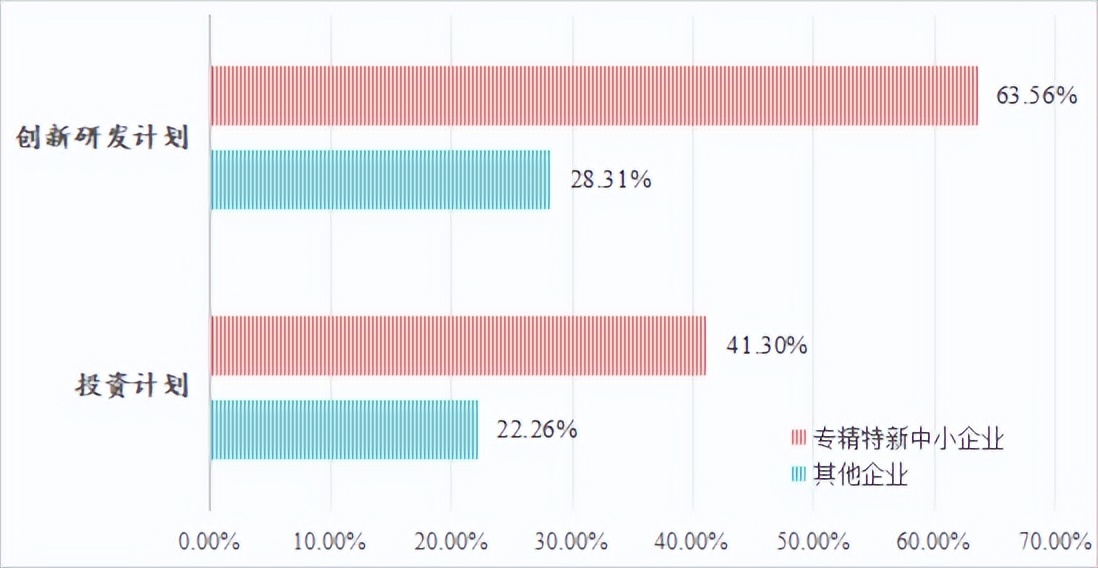 企业发展韧性和信心增强。面对复杂严峻的外部环境和国内经济转型压力,中小企业积极应对、主动作为,在政策支持下,经营状况逐步趋稳。问卷调查显示,2025年营业收入、利润保持稳定或增长的企业占比较上年分别提升10.14和10.65个百分点;但受经营成本上涨等因素影响,利润增幅仍低于营业收入增幅。企业发展信心逐步恢复,未来一年计划创新研发的企业占比保持高位,有投资计划的企业占比较上年有所上升。其中,专精特新中小企业展现出更强的韧性和发展动力,其营业收入保持稳定或增长的企业占比达73.37%,比上年提升8.68个百分点;分别有63.56%、41.30%的企业未来一年有创新研发计划和投资计划。